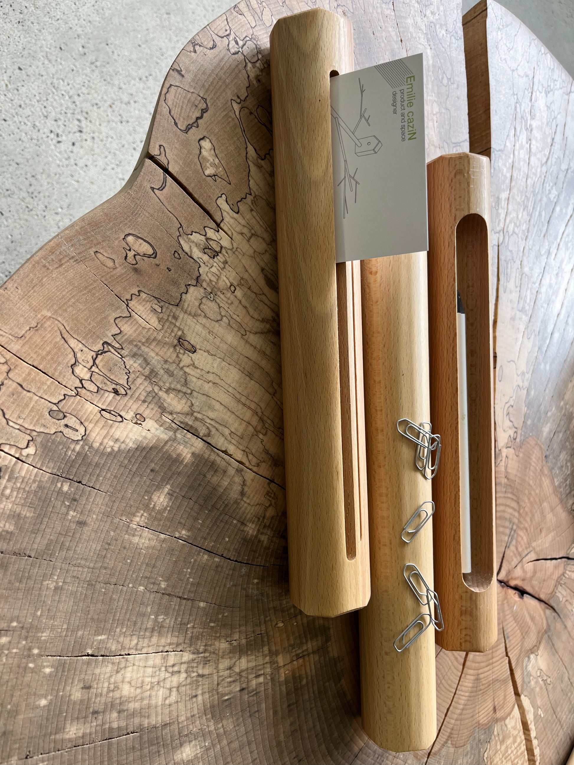 Le premier rondin est un porte-cartes avec deux rainures permettant différents niveaux de présentation de vos papiers, cartes… . Le second est un plumier, il permet de ranger vos stylos et crayons. Le troisième est un rondin aimanté. Un aimant est dissimulé dedans sur toute la longueur. Vous pouvez donc y aimanter vos agrafes, trombones, punaises ou autre objet métallique traînant sur votre bureau.