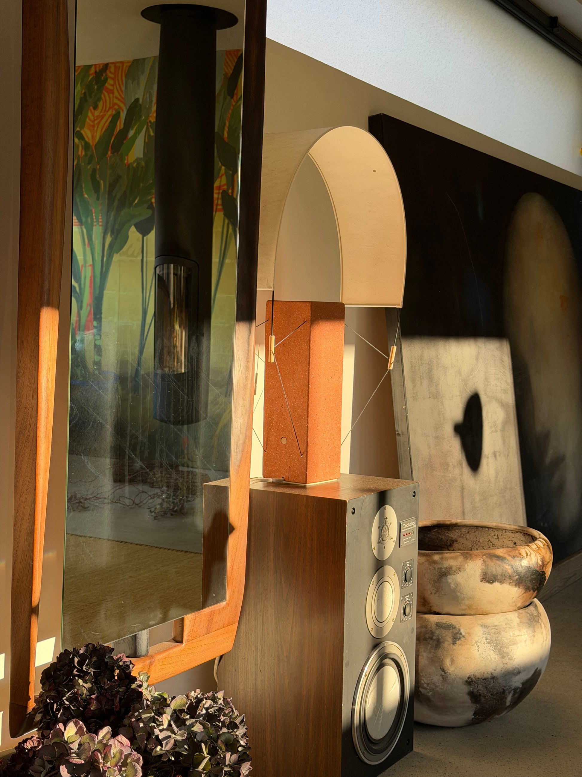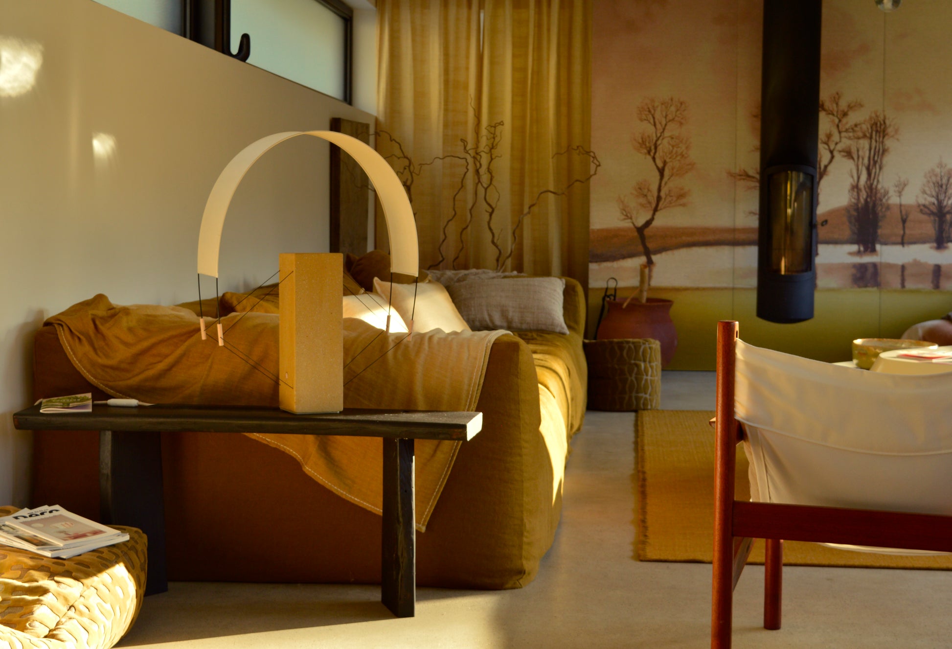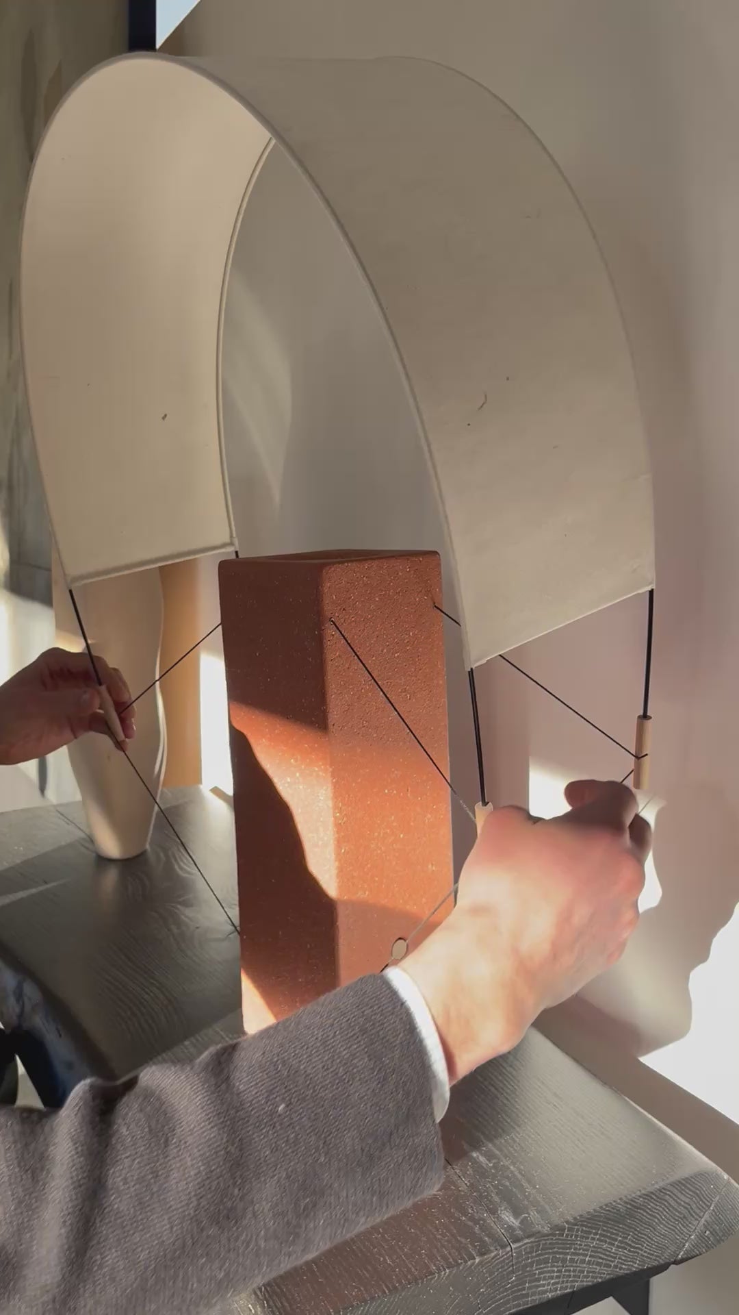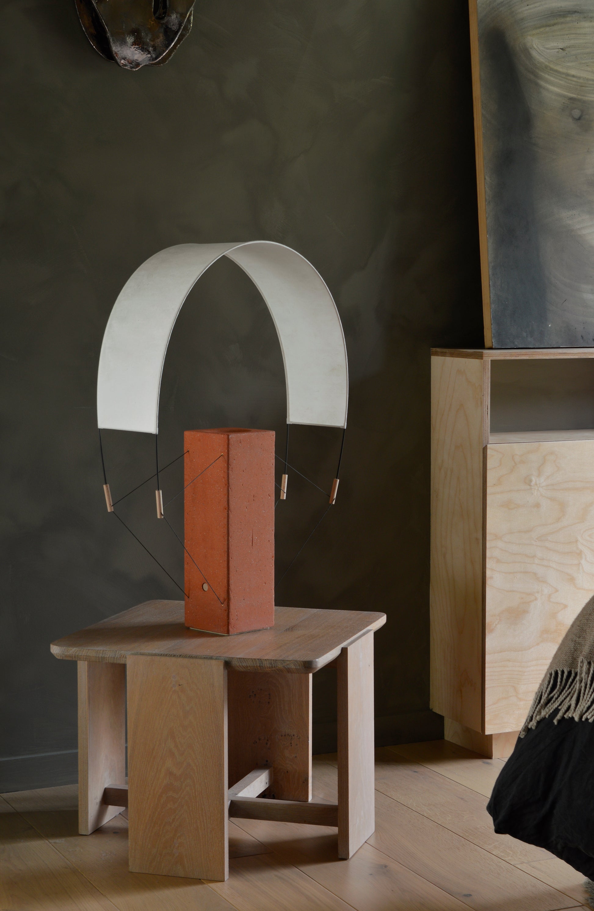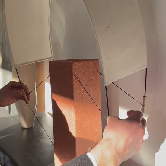 Pied / brique extrudée, bois (hêtre tourné), PLA,laiton, cable lin/coton, patin feutre 100% laine. Voile / papier washi, fibre de verre et cordon Kevlar.