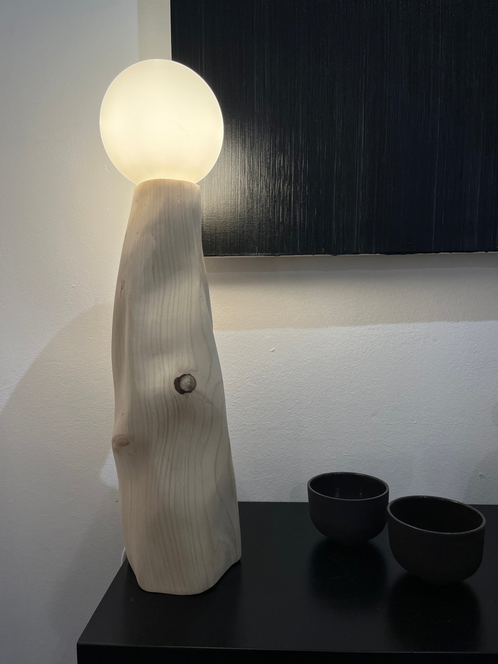 Lampe en pin sculptée à la maison dans nos ateliers. Chaque modèle est unique.